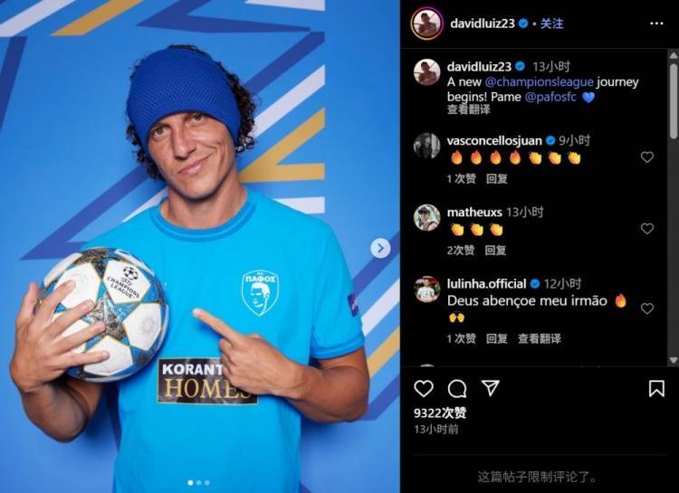 AEP帕福斯后卫大卫-路易斯更新社媒,晒欧冠定妆照,并写道:新的欧冠旅程开启!让我们出发,帕福斯💙